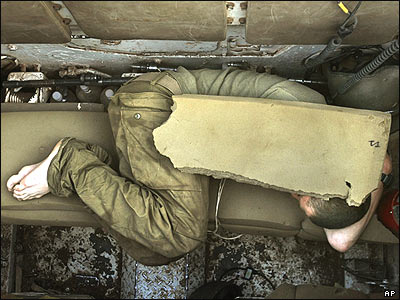 سرباز اسرائيلی در حال استراحت درتانکی در نزديکی مرز اسرائيل و لبنان.
