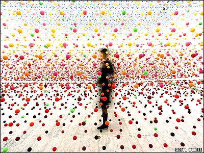 اثر هنری ساخته شده از پنجاه هزار توپ معلق در فضا، از جنس پلی استر، در يک گالری در سيدنی، از هنرمند استراليايی "نيک ساواس". اين اثر هنری "اتم های پر از عشق، پر از شگفتی" نام دارد.