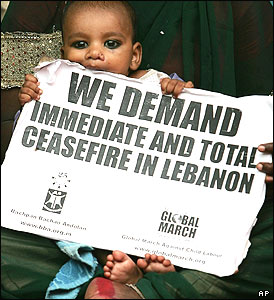 کودکی در دهلی نو پايتخت هند در ميان تظاهرکنندگان مخالف جنگ لبنان، پلاکاردی را در دست گرفته که روی آن نوشته شده: "ما خواستار آتش بس فوری و کامل در لبنان هستيم".