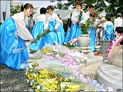 زنان کره ای در حال گل گذاری بر بنای يادبود قربانيان کره ای بمباران هيروشيما. همه سالانه در تاريخ ششم اوت مردم از سراسر ژاپن به هيروشيما می آيند تا به قربانيان هيروشيما ادای احترام کنند.