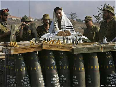 نيروهای ذخيره ارتش اسرائيل در حال به جای آوردن نماز صبح روی گلوله های توپ 155 ميلی متری در مرز اسرائيل و لبنان. امروز جسد دوازده سرباز ارتش اسرائيل که در حمله راکتی حزب الله کشته شده بودند، دفن می شود.