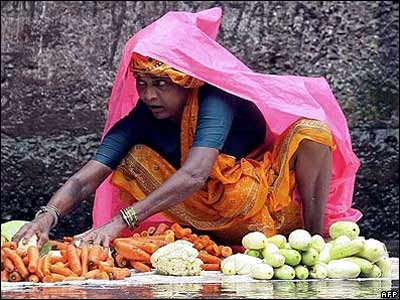ادامه باران های موسمی مانسون در هند: يک فروشنده سبزيجات در هند خود را از باران حفظ می کند.