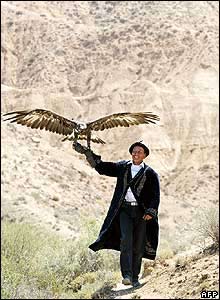 جشنواره پرندگان شکارچی در قرقيزستان: شکارچی اهل قرقيزستان طلابيک شابيروف يک عقاب طلايی را حمل می کند. |