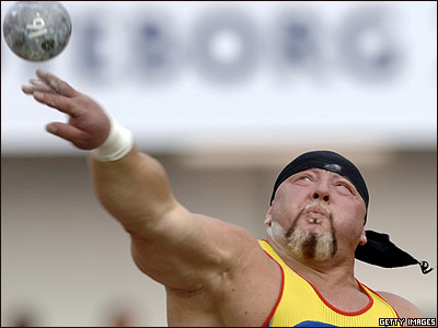 جرجی گاست، از رومانی در حال پرتاب وزنه در مسابقات قهرمانی اروپا در گوتنبرگ سوئد.