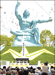 پرواز کبوترهای سفيد بر فراز بنای يادگاری برای قربانيان بمباران ناکازاکی در جزيره کيوشو ژاپن. امروز شصت و يکمين سالگرد بمباران هسته ای ناکازاکی درجنگ جهانی دوم است.