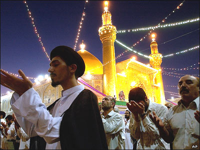 شيعيان عراق در حال دعا در زيارتگاه حضرت علی در نجف در سالروز ولادت امام اول شيعيان. |
