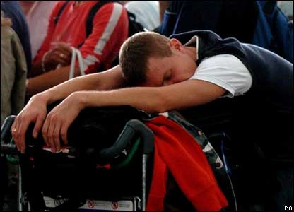 بسياری از مسافران با اميد اينکه بلاخره بتوانند مسافرت کنند در گوشه ای از فرودگاه استراحت می کنند.
