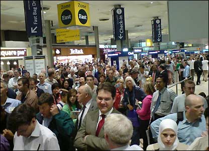 از ساعت شش صبح روز پنجشنبه، 10 اوت، صف های انتظار در فرودگاه های لندن تشکيل و با گذشت زمان به طول آن اضافه شد. فاصله اين مسافر با محل بازرسی در فرودگاه استانستد به ۵۰۰ متر می رسد.