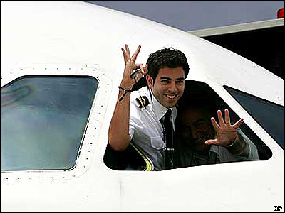 دو خلبان لبنانی در فرودگاه بيروت، پايتخت لبنان. فرودگاه بين المللی بيروت، که بدنبال درگيريها بين حزب الله لبنان و ارتش اسراييل از يک ماه پيش بسته شده بود، اکنون مجددا باز شده است.