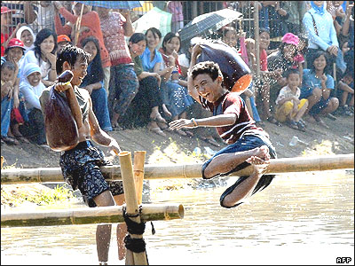 نوجوانان اندونزيايی شصت و يکمين سالگرد استقلال کشورشان را با بازيهای محلی جشن می گيرند.