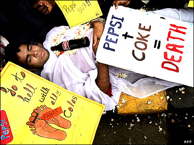 يک دانشجوی هندی در حال اعتراض به فروش نوشابه های شرکت های کوکاکولا و پپسی در شهر بنگلور. دولت ايالت کارناتاکا در جنوب هند، شرکت کوکاکولا را متهم به فروش نوشابه هايی کرده که ميزان مواد آفت کش در آنها در حد غير قانونی بالا بوده و عليه اين شرکت اقامه دعوا کرده است. |
