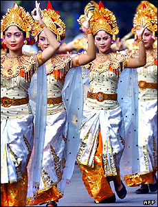 گروهی رقصنده در مراسمی به مناسبت شصت و يکمين سالگرد استقلال اندونزی در جاکارتا، پايتخت اين کشور.