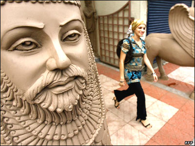 يک زن پارسی در بمئبی هند در نزديکی يک معبد زردشتی. پيروان آئين زردشتی از قرن هفتم ميلادی پس از تسخير ايران، توسط اعراب به هند پناه بردند. آنها که دو در صد جميعت کشور هند را تشکيل می دهند، برای تجليل نوروز و جشن مهرگان به اين معبد می آيند.