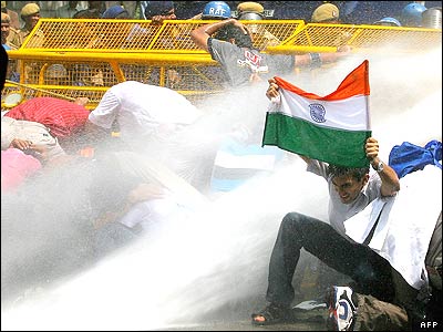 پليس هند در حال تلاش برای متفرق کردن گروهی از دانشجويان معترض. اين دانشجويان در اعتراض به تصويب طرح جنجال برانگيز کابينه هند برای سهميه بندی دانشگاهها و دادن امتيازهای بيشتر به دانشجويان طبقه های محروم دست به راهپيمايی زدند.
