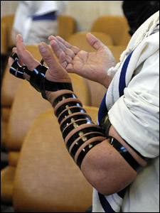 يهوديان در مراسم روزانه مذهبی خود که تفيلا خوانده می شود، تسمه ای سياه رنگ به دور بازوی چپ و انگشت کوچک دست چپ می بندند.