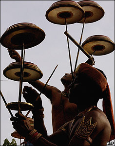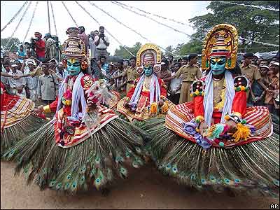 هنرمندان هندی در حال اجرای رقص سنتی به مناسبت اولين روز فستيوال ده روزه جمع آوری محصولات کشاورزی در ايالت کريلا در جنوب هند . |