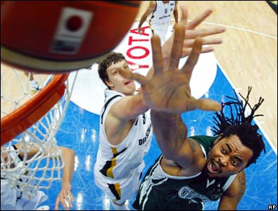 صحنه ای از رقابت تيمهای بسکتبال نيجريه و آلمان در مسابقات جهانی اين ورزش در ژاپن.