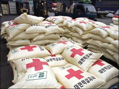 کيسه های برنج از کره جنوبی برای قربانيان سيل در کره شمالی حمل می شود.