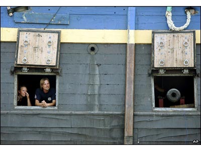 دو تن از خدمه يک کشتی سوئدی که از روی کشتی ديگری مربوط به قرن هجدهم شبيه سازی شده، از دريچه توپ به بيرون نگاه می کنند. اين کشتی که يکی از بزرگترين کشتی های چوبی جهان است با هدف دوستی و تبادل فرهنگی بين سوئد و چين وارد شانگهای شده است.