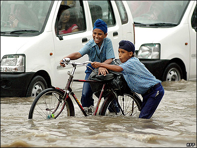 دو پسربچه هندی در شهر امرتسر هند، دوچرخه خود را از جاده ای که در اثر بارش بارانهای موسمی به زير آب فرورفته، عبور می دهند.