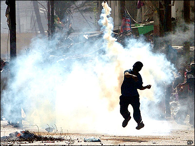 تظاهر کننده پاکستانی در حال پرتاب گاز اشک آور به طرف پليس. قتل نواب اکبر بوگتی رهبر بلوچهای پاکستان موجی از خشونتها و ناآرامی های ضد دولتی را در شهرهای مختلف پاکستان بر انگيخت که به کشته شدن دست کم شش تن انجاميد.