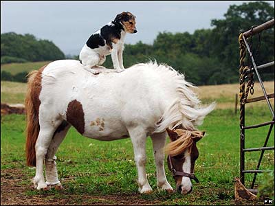 فردی سگ اسب سوار در مزرعه ای در گلاسترشاير انگلستان. صاحب مزرعه می گويد که اين سگ سوار کار ماهری است. |