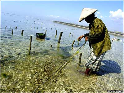 مردی در يکی از سواحل بالی در اندونزی، جلبلک دريايی جمع آوری می کند. جلبک دريايی از محبوب ترين سبزيجات در اين منطقه از جهان به شمار می آيد .