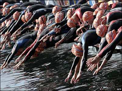 ورزشکاران شرکت کننده در مسابقات ترکيبی شنا - دوچرخه سواری و دو زنان در سوييس به درون درياچه ژنو شيرجه می روند.
