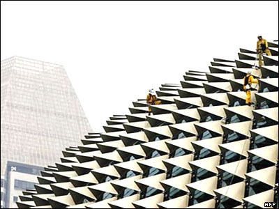 کارگران در سنگاپور سقف گمبدی شکل ساختمان 'اسپيلانده' را که يکی از محل های اجرای تئاتر در اين کشور است، تميز می کنند. |