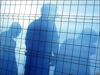سايه يک مامور پليس اسپانيايی در کنار سايه های دو نفر از 124 نفری که در هنگام تلاش برای مهاجرت غير قانونی به اسپانيا توسط گارد ساحلی اين کشور دستگير شدند.