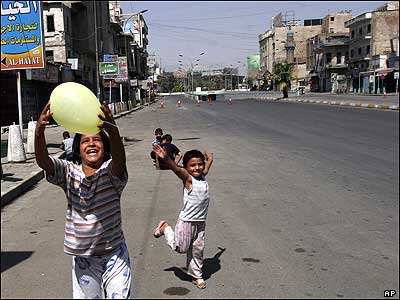 کودکان عراقی در حال بازی در يکی از خيابانهای متروک شهر بغداد. امروز به دليل برگزاری مراسم نماز، رفت و آمد خودروها در بغداد ممنوع بود.
