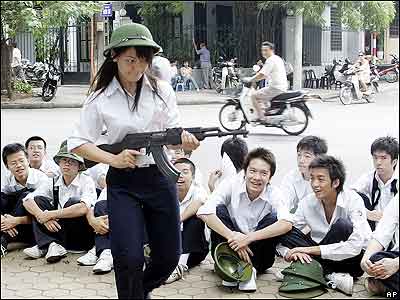 دختر دانش آموز ويتنامی در يک کلاس آموزش نظامی. در ويتنام دانش آموزان در ابتدای سال تحصيلی، موظف به گذراندن يک دوره آموزشی برای ارتقا دانش نظامی خود هستند.
