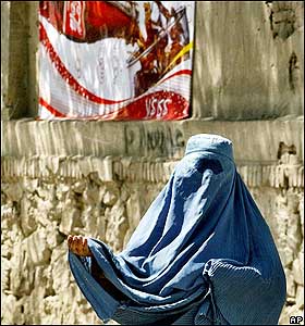 يک زن افغان در حال گدايی در مقابل يک پوستر تبليغاتی کوکاکولا در کابل. امروز پس از حدود يک و نيم دهه، اولين کارخانه کوکاکولا در کابل در حضور حامد کرزی، رييس جمهور افغانستان افتتاح شد.