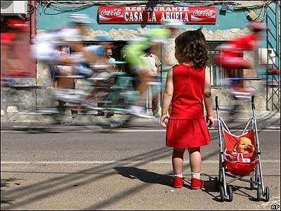 گروهی دوچرخه سوار در جريان مرحله پانزدهم رقابتهای دوچرخه سواری اسپانيا از مقابل چشمان يک دختر بچه عبور می کنند.