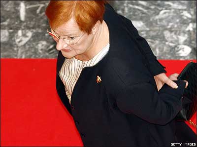 تاريا هالونن، رييس جمهور فنلاند در حال ورود به محل برگزاری اجلاس آسيا - اروپا در هلسينکی. فنلاند در حال حاضر رياست دوره ای اتحاديه اروپا را بر عهده دارد.