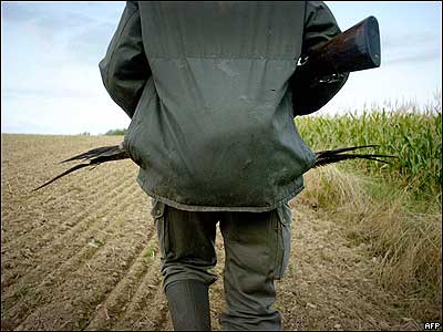 شکارچی ای در شرق فرانسه، قرقاولهايی را که شکار کرده با خود حمل می کند.