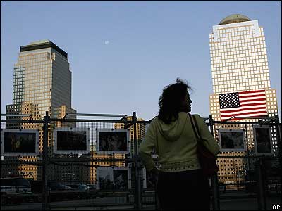 عابری که از مقابل نرده های اطراف محوطه برجهای تجارت جهانی در نيويورک عبور می کند، عکسهايی را که از حملات 11 سپتامبر به نمايش گذاشته شده تماشا می کند.