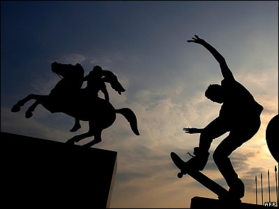 اسکيت بازی در مقابل مجسمه اسکندر مقدونی در بندر تسالونيکی در شمال يونان. |