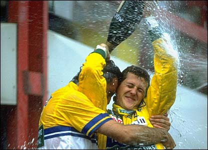 او در سال 1994 همچنان همراه تيم بنتون با پيروزی در هشت مسابقه، و تنها با اختلاف يک امتياز از ديمون هيل، اولين قهرمانی کل اين مسابقات را جشن گرفت.