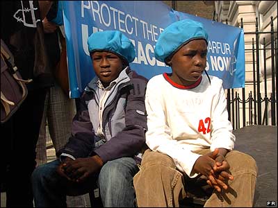 تظاهرات در مقابل سفارت سودان در لندن برای درخواست کمک به قربانيان فاجعه انسانی در دارفور، سودان.