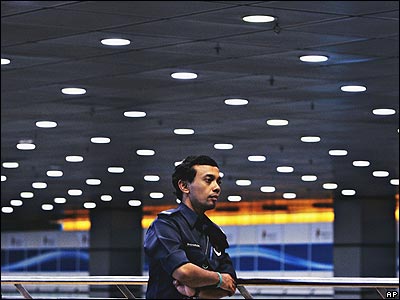 يک مامور پليس سنگاپوری در محل نشست سالانه بانک جهانی و صندوق بين المللی پول در سنگاپور. موضوع اصلی بحث روز دوشنبه مبارزه با فساد مالی بود.
