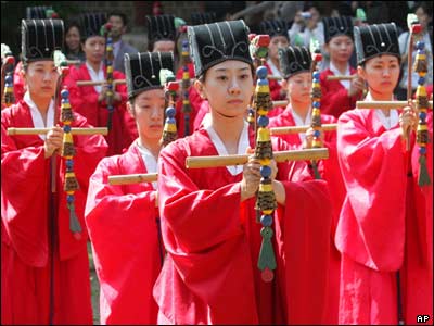 دانش آموزان کره جنوبی با لباس های سنتی در مراسم يادبود کنفوسيوس (انديشمند چينی که حدود 500 سال پيش از ميلاد مسيح می زيسته).