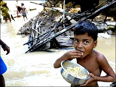 کودک هندی در بنگال غربی در کنار خانه شان که توسط سيلاب ويران شده است.
