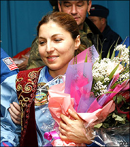 از انوشه انصاری با يک دسته گل رز قرمز استقبال شد