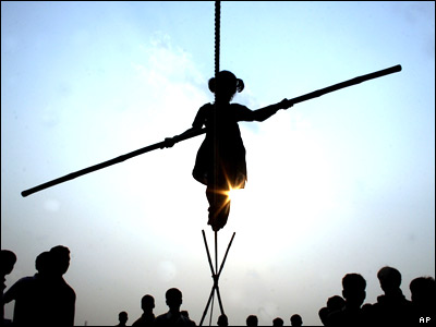 دختر شش ساله بند باز هندی در شهر پتنه هند. اين دختر حدود يک ونيم دلار آمريکايی در مقابل کارش دريافت می کند
