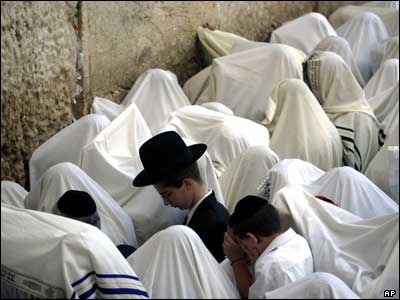 زایرین یهودی در حال خواندن دعا در بیت المقدس به مناسب آغاز جشن مذهبی "سوکوت". طبق اعتقاد يهوديان خروج بنی اسرائيل از مصر در چنين روزی روی داده است.