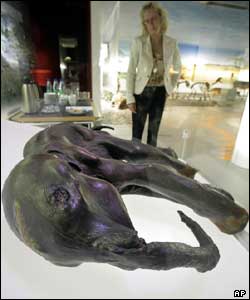 بچه ماموتی 35 هزارساله در موزه باستان شناسی در آلمان. این بچه ماموت در سیبری در شمال روسیه پیدا شده و پس از چهار ماه قرارداشتن در این موزه، به موزه ای در سن پیترزبورگ بازگردانده می شود |