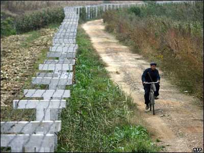 دوچرخه سواری چینی در حال عبور از کنار مرز چین و کره شمالی که با سیم خاردار از یکدیگر جدا شده است.
