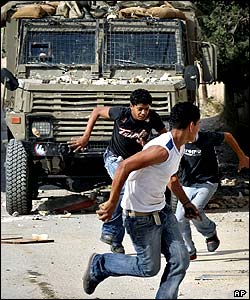 چند جوانان فلسطينی پس از پرتاب سنگ به سوی سربازان اسراييلی از دست آنها می گريزند. اين سربازان اسراييلی در حال اجرای عملياتی در شهر جنين در کرانه باختری بودند.