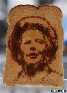 تصویر چهره مارگارت تاچر نخست وزیر سابق بریتانیا بر روی تکه نانی برشته شده. این تکه نان از مجموع آثار هنری است که در نمایشگاه مارمارت در air gallery لندن به نمایش گذاشته شده است. بازدید کنندگان این نمایشگاه تشویق می شوند که از نان برشته به عنوان پرده نقاشی استفاده کنند. |